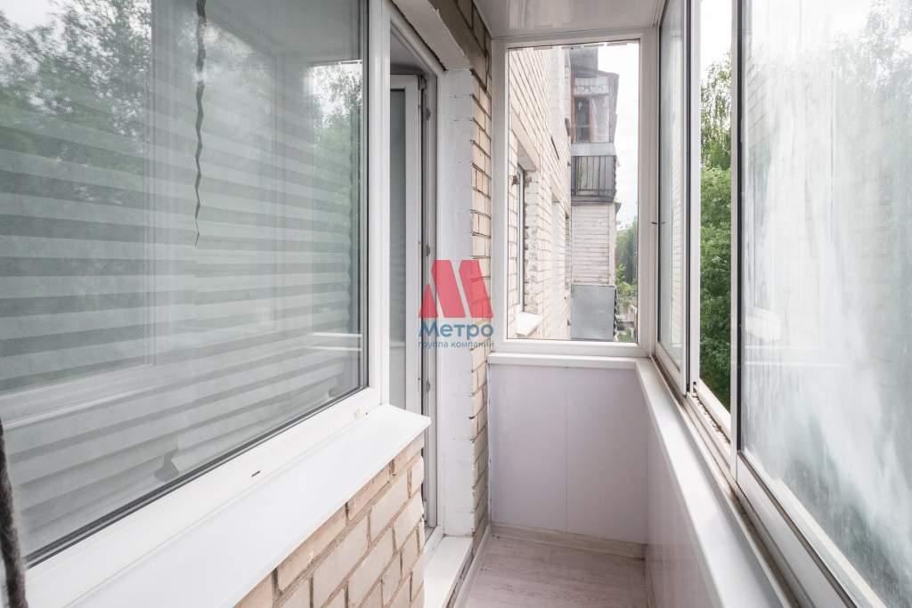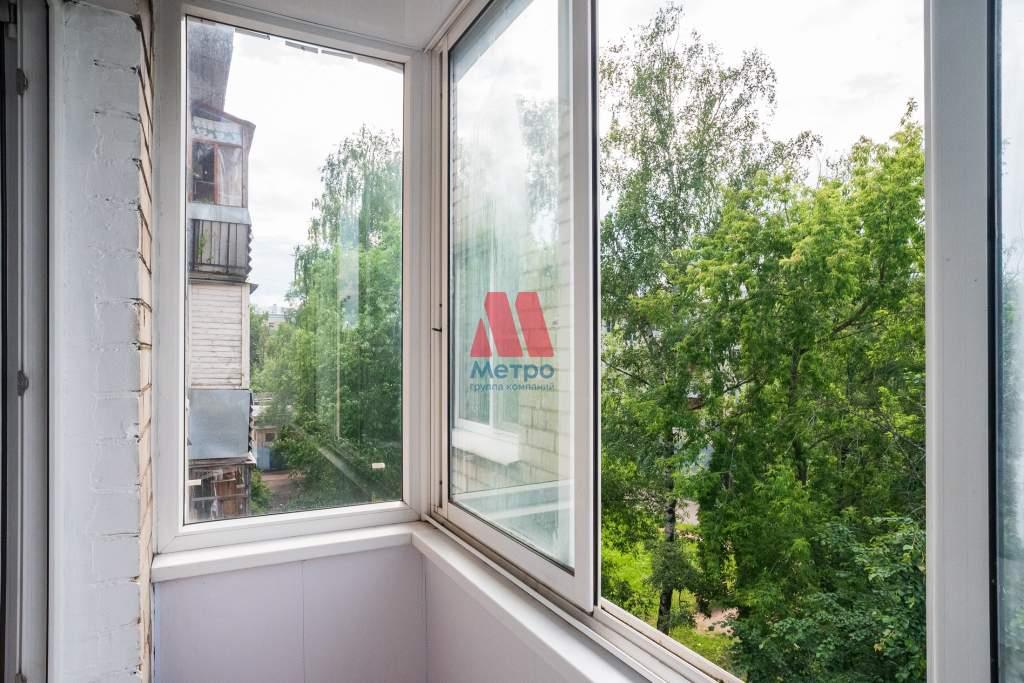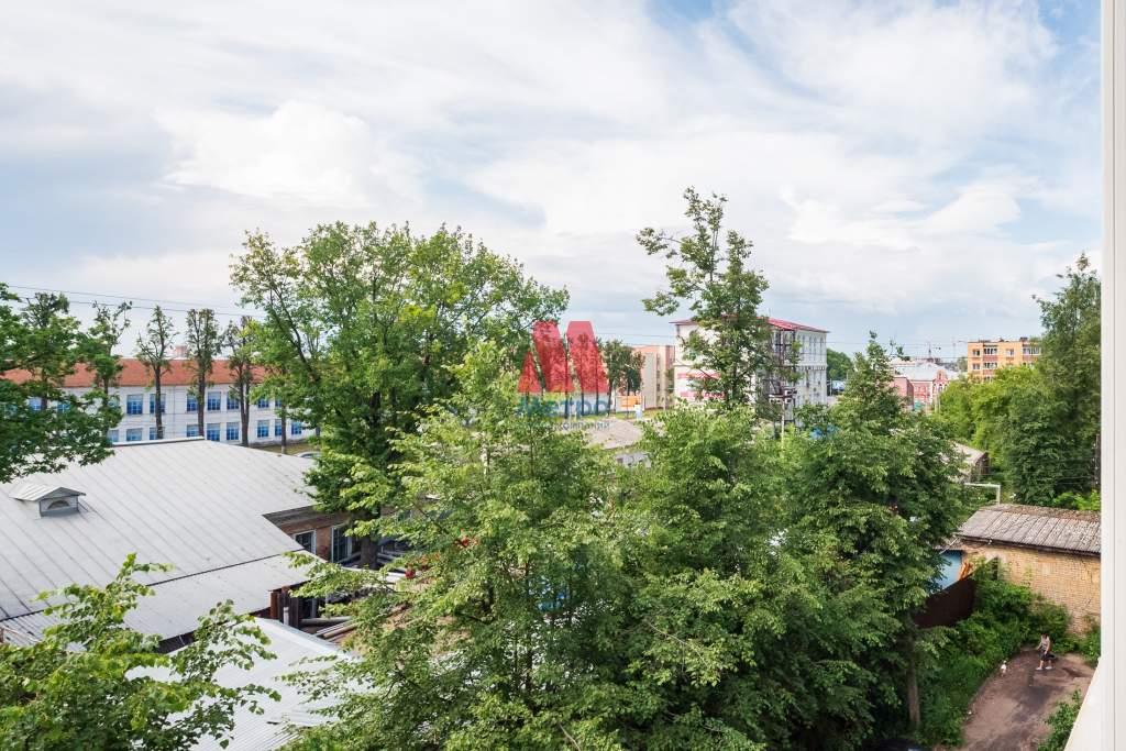 Застекленный балкон, где из окон сквозь зелень открывается вид на военное училище и Московский проспект
