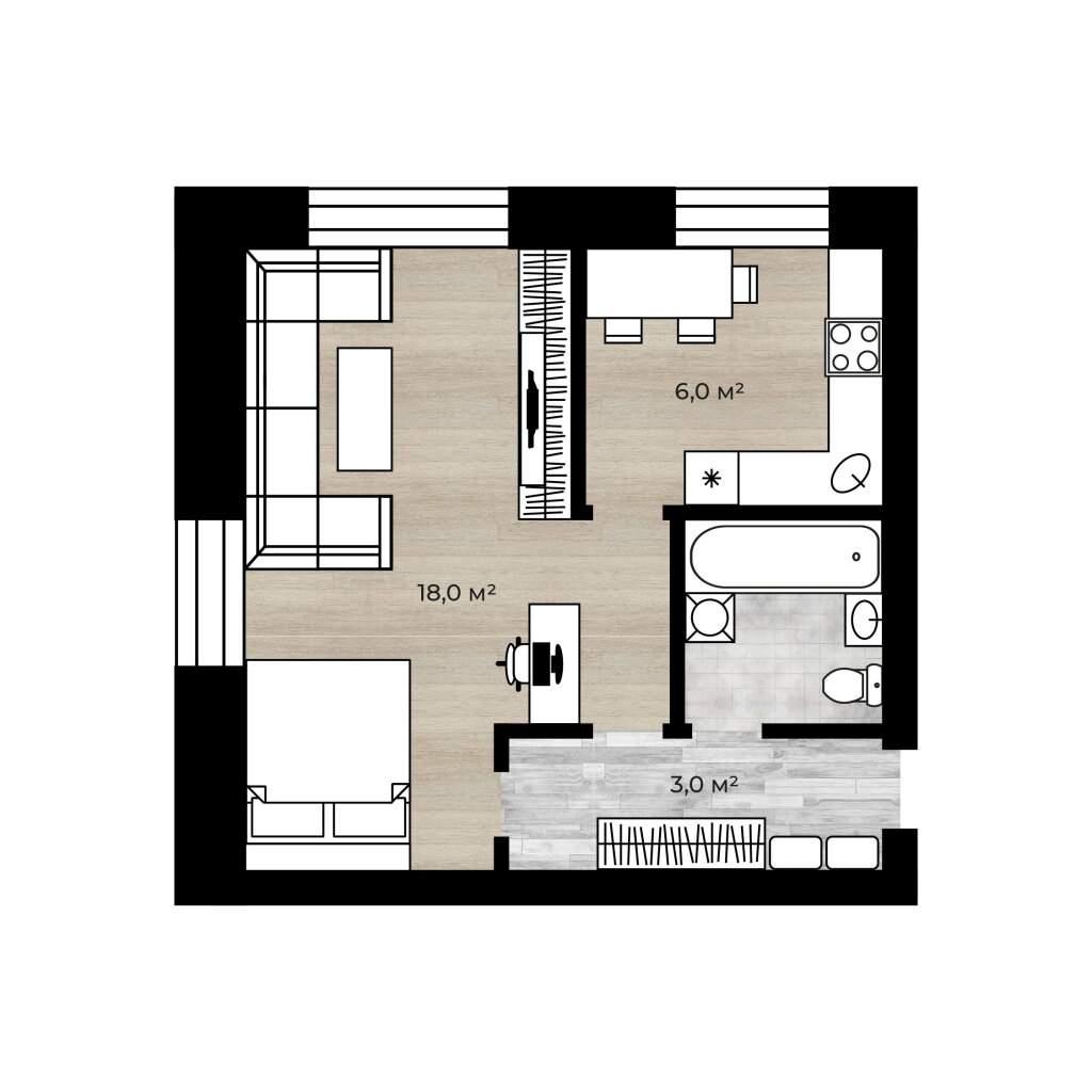 общая 30,8 м2, жилая 18 м2, кухни 6 м2 |