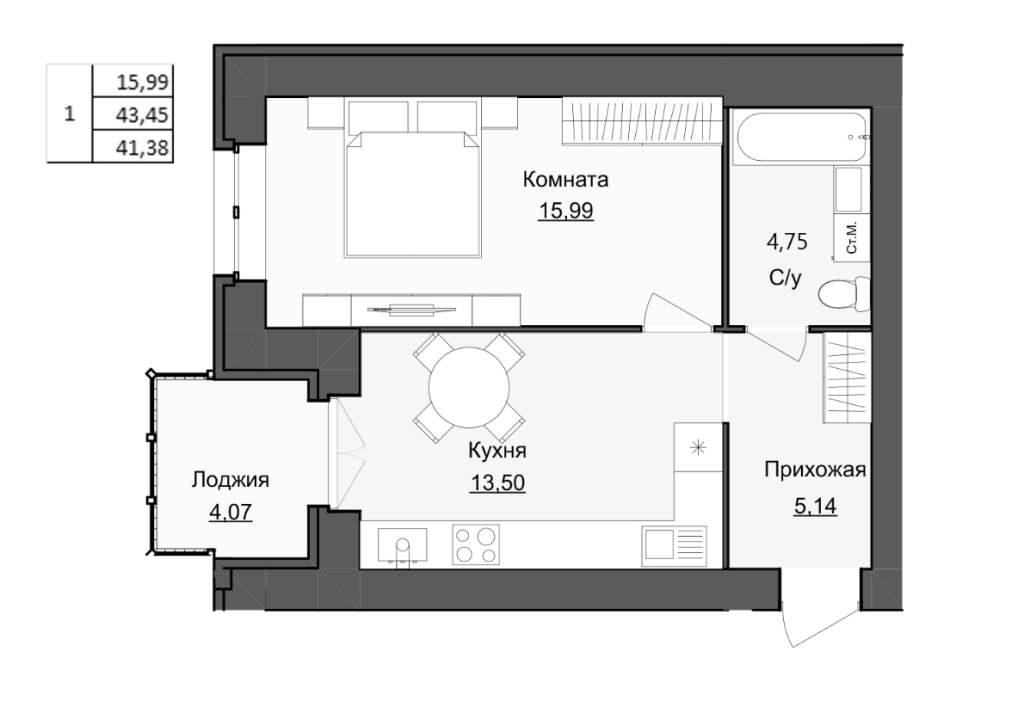 общая 43,45 м2, жилая 15,99 м2, кухни 13,5 м2 |
