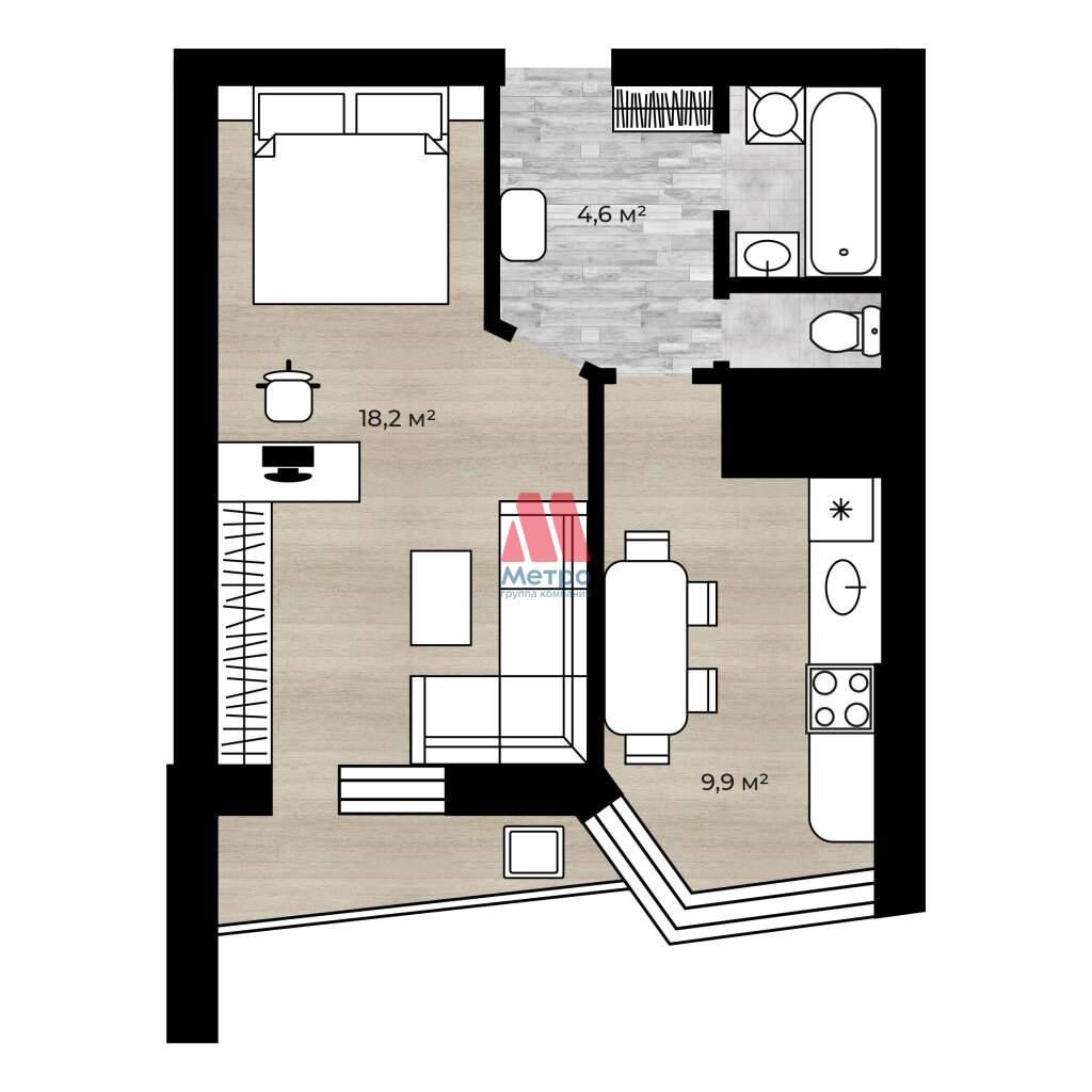 - комната 18.2 кв.м. , кухня 9.9 кв.м. , вместительный коридор 4.6 кв.м. ;