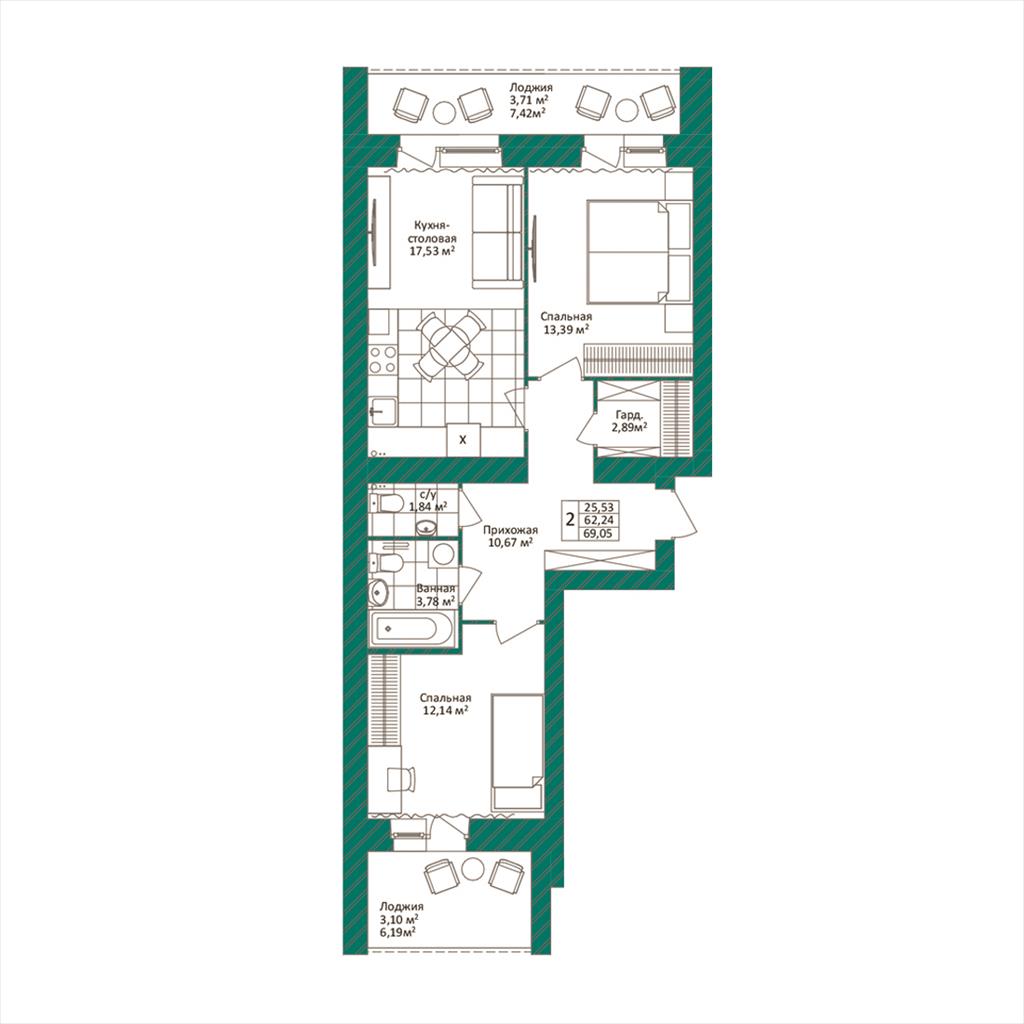 общая 69,05 м2, жилая 25,53 м2, кухни 17,53 м2 |